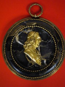 Portrait-Médaillon, BRONZE DORÉ, 6 x 3,5 cm, posé dans un médaillon de marbre noir veiné de blanc, triple cerclage en bronze doré torsadé, perlé ou plein (diam. : 11 cm). Avec suspensoir en bronze doré. Buste de profil dr., cheveux dénoués pendant dans la nuque, calotte de chanoine sur le crâne, col à dentelle retombant sur le costume de religieux.