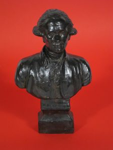 patine noire, H. 26,3 cm, l. 15,5 cm, mention gravée en creux "Linguet" sur le socle. Sans marque ni signature. Buste de face, perruque à marteau et ruban noué dans la nuque, veste ouverte et gilet et jabot de dentelle.