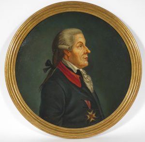 Sous cadre mouluré doré. Portrait en médaillon, buste de profil à dr. sur fond vert, coiffure à marteau et ruban noir sur la nuque, veste vert-gris foncé à col rabattu rouge, jabot de dentelles, croix de l'ordre de Saint-Louis appendant d'une boutonnière.
