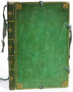 Rel. de récupération du 18e s. : plein vélin vert, plats cernés de filets dorés avec fleurons d'angle au lys royal doré, dos lisse fleurdelisé doré, cordons de fermeture en tissu vert (mors et dos part. craquelés, fente dans le cuir du plat sup., gardes renouvelées, une 50aine de ff. de papier blanc in fine servant à adapter le corps d'ouvrage à la reliure).