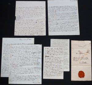 Numérotées de 1 à 5 d'une main ancienne, cachets de cire rouge aux armes du prince de Ligne (1 cachet brisé lors de l'ouverture de la lettre n° 1, les autres lég. fendillés mais complets). Avec transcriptions mss, où sont soulignés les passages imprimés dans le t. III de l'éd. de 1828.