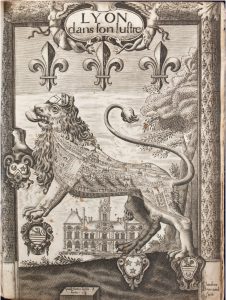 Ce rare volume s’ouvre par un remarquable frontispice qui représente un plan de la ville inscrit sur le corps d’un lion dans un cadre de feuilles de chêne ; l’hôtel de ville occupe le fond de la gravure qui est signée Claudine Brunaud. L’ouvrage, sorte de guide, n’est cité par Brunet dans son supplément que d’après l’exemplaire de la B.N. Le frontispice, de justification plus grande que le volume, est légèrement atteint en tête. Ex libris Joseph Tardy. Rousseurs éparses (Saffroy, II, 28241).