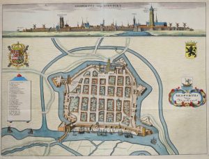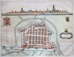 •(1). Neoportus vulgo Nieuport. [Amsterdam, J. Blaeu, 1652]. Plan et vue perspective d'après le relevé du mathématicien et géographe flamand Vaast de Plouich. Extraite de l'édition néerlandaise du "Stedenboeck". L'auteur était appréhendé pour espionnage au moment où il dessinait sur place la vue de Nieuport à la demande de Sanderus. # van der Krogt IV [3056] et [43:121];