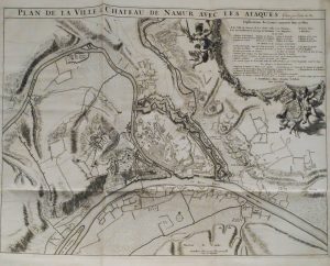 Complet des 4 cartes dépliantes dues à Nicolas Visscher (plan de la ville et du château de Namur, lignes et campements des armées alliées devant le château, plan du camp pris à Woutergem, mouvements et positions occupées lors du siège de la ville).
