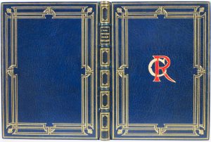 Relié par Weckesser et ses fils : plein maroquin bleu roi, plats cernés de plusieurs cadres entremêlés de filets dorés avec fleurons d'angles, plat sup. portant le monogramme "C.R." mosaïqué en maroq. rouge et blanc, double filet doré sur les coupes, doublures de reps moiré bleu nuit serti de filets et hauchures dorés, gardes de même reps, doubles gardes de papier marbré, tête dorée (très lég. griffe à la couture d'un mors au plat sup.).
