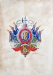 • des armoiries de la France très finement AQUARELLÉES par P. Prud'homme, sur PEAU DE VÉLIN, à pleine page (décharges de papier acide sur le recto et aux bords du verso),