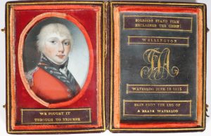 " RELIKS FROM THE FIELD 0F WATERLOO 18 June 1815". Souvenir de la bataille de Waterloo : diptyque contenant un portrait peint et un morceau de peau humaine. Sous écrin,