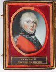 -Volet gauche : peinture sur IVOIRE (# notes personnelles de J.J.), figurant un officier de l'armée britannique, âgé d'une trentaine d'années, en buste de 3/4 g., portant uniforme rouge aux épaulettes d'argent et boutons d'argent, cravate noire et jabot de dentelle, collet noir et revers en pointe avec bouton et galon d'argent au collet. Sous le portrait, mention imprimée sur cuir : "We fought it/ through to Triumph".