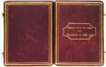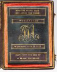 9 x 7 x 1,5 cm, en cuir aubergine à grains longs dont les plats sont sertis de filet doré (mention "Reliks from the field/ of/ Waterloo, 1815" sur le plat sup.), deux fermoirs en métal doré.