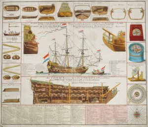 NUEWE [sic] TAFEL VOOR ALLE LIEFHEBBERS en zeevarende persoonen vertoonende een oorloghs-schip [...]. Table de tous les termes des principales parties avec les appareaux d'un vaisseau de guerre [...]. Amsterdam, J. Covens et C. Mortier, s.d.