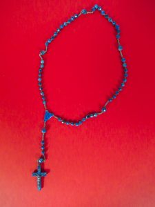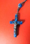 Cinq dizaines de grains biseautés en pierre bleue (lapis lazuli ?), de deux grosseurs différentes, croix carrée en même métal, 5 grains finaux (1,3,1) et Christ (en argent ?) sur croix de pierre bleue (H. : 5 cm).