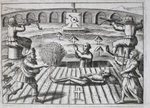 Première édition illustrée par Matthaeus Merian d'1 pleine page et de 16 in texto dont 12 emblemata figurant les retrouvailles du Roi et de la Reine pour produire la pierre philosophale accompagnés de Saturne et de son loup hurlant (symbolise la purification de l'or et de l'argent), le Roi et la Reine s'unissant dans le personnage de Mercure adolescent, etc., la dernière clé représente l'alchimiste arrivé à la fin de son oeuvre avec e.a. en arrière-plan la lune et le soleil unis;