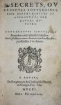 Voet donne un résumé du problème de la paternité de l'ouvrage (attribué actuellement à Ruscelli, 1500-1566) ainsi que de la complexité de l'édition. Les recettes traitent de purge, de remèdes contre la vérole, les coups, la pleurésie, les écrouelles, la toux, la douleur de l'accouchement, de la dorure de l'acier ou du fer, etc., mais aussi de cosmétologie, avec les moyens de fabriquer huiles, onguents, poudres... Donne aussi quelques exemples de guérison parfois invraisemblables et des recettes plutôt dangereuses ! Les recettes techniques relèves de la peinture, de la laque des bois, des encres, de la teinturerie, etc. Marque de Plantin rehaussée au volume I.