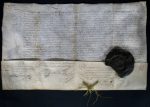 En français, sur PEAU DE VÉLIN, 31,5 x 52 cm, signature du roi et divers fonctionnaires (sceau de cire noire cassé avec partie manquante). Sous passe-partout et cadre de bois (vitre absente).