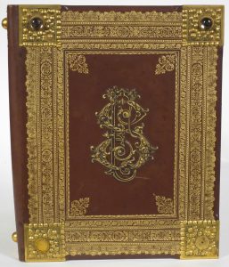 Sous chemise en veau brun foncé couvrant des ais biseautés, larges et riches cadres sur les plats marqués aux angles par des écoinçons de métal doré portant des billes de verre et par des fleurons d'angles cernant le monogramme "E S", doublures de tissu doré serti de remplis de cuir fleuronné doré, signet de soie jaune retenant le document manuscrit (1 bille de verre décollée et 1 remplacée par une autre mais plus petite).