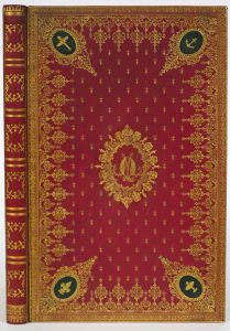 In-f°. Rel. de l'époque : plein maroquin rouge, plats entièrement décorés aux petits fers dorés avec semé d'hermines, cadres et roul. diverses cernant le monogramme central "M Q" et médaillon en maroq. vert aux angles fleuronnés (croix, ancre, calice et fleur-de-lys), dos lisse à faux caissons fleuronnés dorés, roul. fleuronné dorée sur les coupes et remplis, tranches dorées. Sous emboîtage en percaline chagrinée verte (part. abîmé).