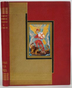 Relié par J. Hendrickx & A. Guidée : plein maroquin rouge et maroq. olive à mi-partie, plat sup. orné d'une plaque ÉMAILLÉE (saint Michel terrassant le dragon) cernée de listels de maroq. noir et d'un filet doré, dos lisse, doublures de reps moiré ivoire cerné de maroq. rouge et de filets et roul. dorés, gardes de même reps, tranches dorées (bords du plat sup. lég. foncé, très lég. égratignures sur les plats). Sous emboîtage en demi-maroq. et papier rouges.