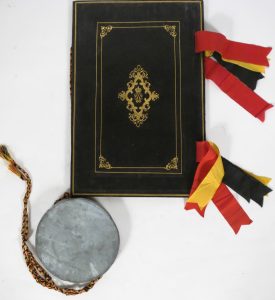 Prestigieuse collection de Jean Jadot, spécialiste des Pays-Bas autrichiens et numismate, centrée sur Charles de Lorraine, Marie-Thérèse d’Autriche, François Ier, Joseph II… et composée d’objets (bustes, calices, gobelets en cristal, peintures…), d’ouvrages, de dessins originaux et de médailles, d’un manuscrit inédit de Cobenzl relatant son voyage en France avec Joseph II, d’ouvrages du Prince de Ligne, etc. Nombreux ouvrages de littérature française essentiellement, illustrés par de grands artistes (Bécat, Decaris, Baudier, Elskamp, Collot, Maurice Denis et sess « Petites fleurs de saint François d’Assise »…), dans de belles reliures (signées Herbillon-Crombé, Semet & Plumelle, Clovis Lagadec et décorée par Lehaye…), ex. enrichis… Fables choisies de La Fontaine (276 pl. d’après J.-B. Oudry) Esoterica : Malleus maleficarum (éd. orig.), Tripus Aureus (1st ed.), ouvr. sur la sorcellerie et l’exorcisme, plusieurs en français (par Jean Bodin, Henry Boguet…) Sciences : botanique (Revue de l’horticulture belge et étrangère, 39 vol., +/- 743 chromolithographies), médecine (Leeuwenhoek, Palfijn), Descartes (De homine figuris), mathématiques, globe – Incunables (« Tractatus de virtutibus herbarum », rare 1re éd. en italien, 150 in texto), éditions du XVIe s. (Roland Furieux), Manuscrits : signature de Louis XIII, lettres patentes (une signée par Louis XIV à 10 ans), lettre de Magritte. Dessins originaux et estampes anciens, collection de 124 portraits d’après Van Dyck, dessins pour l’Énéide et les Géorgiques par le Baron Gérard et Girodet, Voyages : costumes italiens par Sgroppo, Suisse par Zurlauben, cartes postales figurant des théâtres et casinos (français surtout). Généalogie & noblesse, histoire, arts, religion, devotionalia (crucifix, rosaires…).