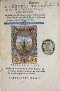 Sanctus GREGORIUS Turonensis. Historiae francorum libri decem [...]. Parisiis, apud Guil. Morelium, et Gulielmum Guillard, ac Almaricum Warancore (excudebat Guil. Morellus), 1561.