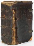 Titre typographique dans un encadrement figurant des scènes religieuses et les évangélistes. Plein veau estampé à froid sur ais de bois de l'ép. (n.c., mouill., défauts, manques de cuir).