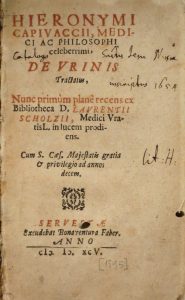 Servestae [ Zerbst], excudebat Bonaventura Faber, 1595. In-8° : [12]-196 [i.e. 194]-[2 bl.] pp. (copy browned, long wormholes with lack in the first half, ms. provenance on the title-page, some foxing, 1 marginal tear repaired p. 9). Contemporary binding : dark calf, ribbed spine (wears, mark of a medallion supposed to be gilt (?), turn ins lacking, small wormholes at the spine, one corner lacking and another dulled). FIRST EDITION of this work by Capivaccio (+ 1589), edited by Lorenz Scholz. The physicist from Padova, following Hippocrates and Galen, insists on the importance to study urines to make a correct diagnose and to group all the observations in a particular science. Capivaccio thought, as the Greek physicists and Aristoteles that urine is a secretion from the liver, dragged by the kidneys.