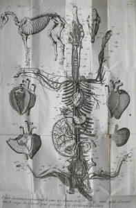 Illustré de 10 planches dépliantes figurant l'anatomie du cheval, des squelettes, organes, des fers et une musaraigne dont on pensait, jusqu'à Lafosse, que la morsure contenait du venin et était dangereuse pour le bétail et les chevaux en particulier.