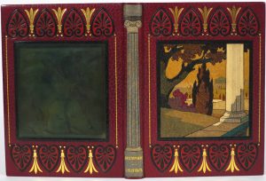 In-12°. Relié par Clovis Lagadec et décoré par Lehaye : plein maroquin bordeaux, plat sup. orné d'un paysage mosaïqué en cuirs de couleurs et cerné de palmettes et fleurons mos. ou dorés, dos lisse mos. en long d'une colonne grecque portant le titre doré, plat inf. orné d'un cuivre et et du même décor de palmettes et fleurons, gardes de papier marbré serti aux contreplats d'une guirlande de trèfles et demi-cercles dorés, tête dorée, couv. et dos cons. (charnière sup. int. lég. fendue avec pet. manques). Sous chemise à rabats en demi-maroq. bordeaux à bandes. Sous étui bordé. 20 gravures en couleurs (grandes compositions in texto ou à pleine page).