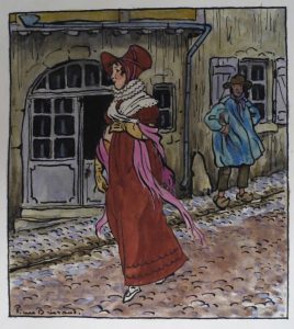- 1 AQUARELLE ORIGINALE, 10,5 x 9 cm, signée, non retenue pour l'illustration, figurant l'héroïne se promenant en rue,
