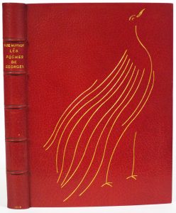In-4°. Rel. de l'époque : plein maroquin rouge, plat sup. décoré de la silhouette d'un oiseau suggérée par des filets dorés, dos à nerfs, doublures et gardes de daim gris, doubles gardes de papier artisanal, tranches dorées, couv. et dos cons. (3 minuscules épidermures au centre du dos). Sous étui bordé.