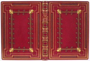 In-12° (qqs rouss., assez fortes aux pp. 4-5, 38-39 et 54-59). Relié par Vautrin : plein maroquin bordeaux, plats richement décoré de plusieurs cadres de filets dorés ou à froid, listels de maroq. brun ou vert, guirlandes de feuilles et de fleurons d'angles dorés, dos à nerfs et caissons rappelant le décor des plats, double filet doré sur les coupes, doublures et gardes de reps moiré bordeaux serti de maroq. bordeaux, de filets dorés ou à froid et de fleurons d'angles dorés sur les doublures, doubles gardes de papier marbré, tête dorée, couv. et dos cons.