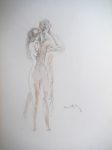 - 1 DESSIN ORIGINAL aux crayons noir et bistre, à toute page, signé, figurant une jeune femme nue buvant de l'eau,