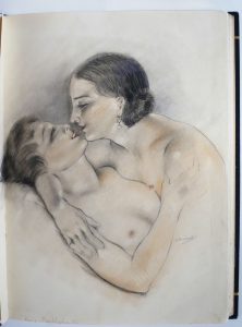 - 1 DESSIN ORIGINAL aux crayons de couleur, signé, titré "L'Amie complaisante", préparatoire au hors-texte "L'Offrande à la déesse" (p. 26),