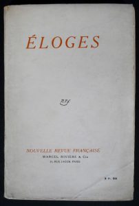 [ SAINT-JOHN PERSE (sous le pseudonyme de SAINTLÉGER LÉGER)]. Éloges. Paris, Éditions de la Nouvelle Revue Française, Marcel Rivière & Cie, (6 juillet 1911).
