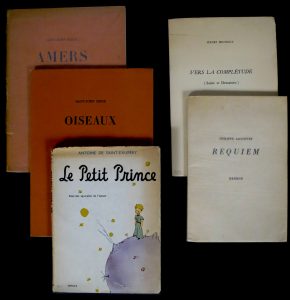 Le Petit Prince, avec des dessins de l'auteur. P., NRF Gallimard, 1945, in-8° pleine toile ill. d'éd. (part. passée), sous jaq. ill. (abîmée). 1re éd. imprimée en France.
