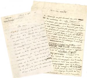 collaboration, conseillé par Lemoine qui voudrait accueillir la pièce au Gymnase, à condition qu’elle prenne un aspect comique. Labiche fait part de ses scrupules : « La douleur et la misanthropie de Geoffroy doivent être comiques, c’est un cocu qui se retire à la campagne, loin du monde pour y planter des pommes de terre avec amertume ». Mais cette vie monotone et sans confort lui pèse et il en vient à envisager de reprendre sa femme : « il va céder, lorsque la voix de l’honneur reprend le dessus, pas de pitié pour l’infidèle ! etc., etc. Il y a là un combat qui me parait faire la pièce. Mais sera-t-elle bien Gymnase ? A vous de décider »...{CR} On joint la L.A.S. d’Édouard Lemoine (3 p. in-8 à en-tête du Théâtre du Gymnase Dramatique), demandant à Labiche d’aider Marville et de faire « sortir de là quelque chose d’aussi vif, d’aussi gai, d’aussi comédie que Le Monsieur qui prend la mouche »…{CR}