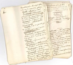 novembre 1856, avec, dans les principaux rôles, Arnal (Montenfriche), Ravel (Léon de Fluteville), Amant (Veauluisant), Lhéritier (le commissaire-priseur Grivet), Octave (l’aubergiste Badayos), Mme Octave (Mme Clotilde de Montenfriche), Mlle Laurence (Berthe, fille de Veauluisant) ; publiée par Michel Lévy [OC, t. IV, p. 195] ; {CR} Manuscrit autographe de Marc-Michel, selon une note de Labiche (« manuscrit de Michel », sur le feuillet déchiré d’enveloppe), incomplet, de l’acte II (pages 4-48, incomplet du début et de la fin) et l’acte III (pages 3-47, incomplet du début), avec quelques ratures, corrections et additions marginales ; le texte est assez proche du texte publié, sauf la fin qui a été considérablement transformée.{CR}