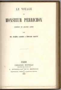 Eugène LABICHE et Édouard MARTIN. Le Voyage de Monsieur Perrichon (Paris, Librairie nouvelle, A. Bourdilliat et Cie, 1860), in-12, relié veau fauve, cadre intérieur orné de filets, roulette et fleurons dorés, couverture muette de papier vert...