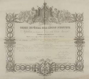 chevalier à compter du 13 août 1861, avec griffes de Napoléon III et du Grand Chancelier l’amiral Hamelin, contresigné par le secrétaire général le général Louis-François Maizière. Plus 2 lettres d’avis de nomination aux grades de chevalier de la Légion d’honneur (24 août 1861, par décret du 13 août), puis d’officier (13 juillet 1871, par décret du 9 août 1870).{CR} On joint le brevet de la décoration du Lys de son père, Jacques-Philippe-Marin Labiche (10 novembre 1814) ; plus la traduction d’une patente d’Alexandre III de Russie nommant Labiche chevalier de 2e classe de l’Ordre de Sainte-Anne (1882) ; et 2 cartes d’invitation de la Maison de l’Empereur (avec enveloppes) pour une soirée au Palais des Tuileries (mardi 8 mars) et un dîner au Palais de Compiègne (4 décembre [1864]).{CR}