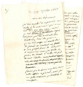 Eugène LABICHE. L.A. (minute inachevée), Souvigny 5 juillet 1865, à son « cher défendeur » ; 4 pages et demie petit in-4.{CR} Brouillon de lettre à son avocat. Il est immobilisé par un accident : « Je me suis rompu un muscle de la...