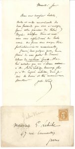 Jules VERNE (1828-1905). L.A.S., Mercredi soir [5 février 1868], à Eugène Labiche ; 1 page in-8, enveloppe.{CR} Il le remercie des fauteuils « que vous m’envoyez pour votre première du Palais Royal [Le Papa du Prix d’honneur, 6...