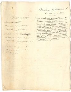 p. 74]. Une Baronne veuve (jouée par Mme Lesueur) vend au rentier Marchavant (Étienne Pradeau) son château, avec tout son mobilier, devant le notaire Lamblin (Émile Francès) ; mais elle veut en excepter les œuvres de Voltaire, qu’elle a promis à son confesseur de brûler ; ce que refuse Marchavant, fervent admirateur du patriarche de Ferney… Tout finira bien avec le mariage de Maxime (F. Achard), neveu de Marchavant, et Alice, la fille de la Baronne (Maria Legault).{CR} Manuscrit entièrement autographe de Labiche. Écrit à l’encre brune sur papier vergé d’Hudelist à Hallines, il présente des ratures et corrections, des additions, des passages biffés et refaits dans les marges ; des changements de paginations témoignent de remaniements. Il y a deux pages 1, la première portant le titre, la liste des personnages (le nom de la Baronne de Montruffé a été biffé), et le décor. La fin a été entièrement remaniée : le manuscrit, qui compte 16 scènes, présente une première version de la fin, scènes 11-16 (pages 60-78). Puis Labiche a rédigé une nouvelle fin, plus ramassée, paginée 1 à 13, qui continue la scène 10 en commençant par la réplique de Maxime : « Tout est manqué ! », et se poursuit par l’actuelle scène 11 et dernière.{CR} On joint le feuillet qui enveloppait le manuscrit, avec titre autographe.{CR}