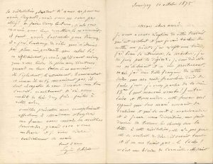 Eugène LABICHE. L.A.S., Souvigny 16 octobre 1875, à Émile Augier ; 4 pages in-8.{CR} Sur leur collaboration pour Le Prix Martin [créé le 5 février 1876 au Palais-Royal]. Il a reçu le travail d’Augier qui le satisfait, sauf une scène :...