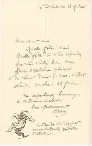 Amédée de Noé, dit CHAM (1819-1879) caricaturiste. 3 L.A.S., dont deux avec dessin, 1877-1879, à Eugène Labiche ; 1 page petit in-8 chaque (2 à son chiffre couronné), 2 enveloppes.{CR}...Invitations à dîner ; le 16 février, il ajoute :...