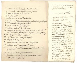 « homme de lettres » Valatour (qui avait été le pion de Paul), Mme Lanfoudras et sa fille Henriette. Mme Minoreille donne des soirées, au grand désespoir de son mari ; Paul promet à son oncle de le débarrasser à jamais des invités de sa femme, et va s’arranger, avec la complicité des domestiques, pour gâcher la soirée à venir… quand arrivent Mme Lanfoudras et sa fille Henriette, que Paul doit épouser. Marivaudage de Valatour et Mme Lanfoudras. La soirée tourne à la catastrophe : Théophile empeste l’ail et Ludovic le musc, les sirops sont remplacés par de la piquette, on sert de la soupe aux choux, les gâteaux sont immangeables, le divan est couvert de poivre, etc. Mais tout finira bien…{CR} Un premier feuillet dresse la liste des 18 scènes, avec les personnages qui y apparaissent et les principales péripéties. Suit le scénario détaillé (paginé 1-23), où les 18 scènes sont développées, avec des ébauches de dialogues.{CR}
