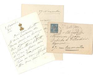 Princesse MATHILDE (1820-1904) fille de Jérôme Bonaparte, cousine de Napoléon III. 2 L.A.S., 1880-1885, à Eugène Labiche ; 3 et 2 pages in-12, à son chiffre couronné, enveloppes.{CR} 27 novembre [1880] : elle n’a pu se rendre à sa...