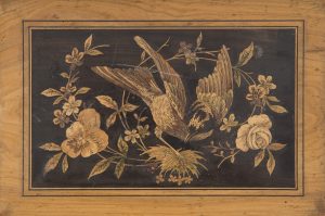 [Eugène LABICHE]. Album photographique contenant 35 photographies ; album oblong 15,5 x 22,5 cm, reliure composée plats en bois verni, plat sup. de marqueterie de bois (oiseaux et fleurs), le plat inf. avec médaillon de fleurs peintes et...