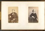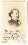l’inscription Nice, dos chagrin fauve orné, tranches dorées, fermoir ; photographies montées dans des ff. cartonnés à fenêtre (plusieurs non remplis), la plupart sur papier albuminé monté sur carte format carte de visite (cassure désolidarisant qqs ff. de l’ensemble).{CR} Eugène Labiche (4, dont 3 par Nadar), sa femme Adèle (3, dont une avec André), leur fils André (par Nadar), son père Jacques-Marin Labiche ou son beau-père Jean-Baptiste Hubert (4) ; Napoléon III (par Disdéri), Félix Nadar (par lui-même en ballon, 4), Émile Augier (par Nadar), l’acteur Lhéritier (par Bingham), Mme Aubernon (par Nadar)…{CR} 5 photographies sont dédicacées. Raymond Deslandes (par Grob) : « à mon ami et collaborateur Eugène Labiche Raymond Deslandes ». Léon Dormeuil (directeur du Théâtre du Palais-Royal, par Bayard & Bertall) : « à Eug. Labiche souvenir reconnaissant de son dévoué Léon Dormeuil ». Alexandre Dumas fils (par Franck) : « Mon cher Labiche – sachant combien vous aimez l’Empereur je vous envoie le seul portrait de moi qui lui ressemble – à vous. A. Dumas f ». L’acteur Hyacinthe (par Franck) : « Bien des compliments à toi Hyacinthe ». Le chanteur Prilleux (par Bingham) : « à M. E. Labiche souvenir du voyage en Chine Prilleux 15 décembre 1866 ».{CR} 5 photographies ont été identifiés au dos par Labiche : Louis Leroy (par Pierre Petit), Maquet (par Nadar), Marc-Michel (par Martinet), Mélesville (par Disdéri), M. de Sacy (par Nadar). Plus 5 non identifiés.{CR}