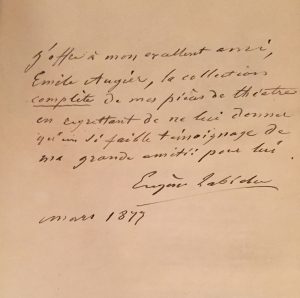 mouillures marginales sur quelques textes).{CR} Rare recueil de cinquante pièces de théâtre en éditions originales, constitué par Labiche pour Émile Augier. Les brochures de petit format ont été montées à fenêtre pour obtenir un format uniforme ; les couvertures-titres n’ont pas été conservées. À la fin du tome II, Émile Augier a dressé lui-même la table des 18 pièces de ce volume.{CR} Envoi autographe de Labiche en tête du tome I : « J’offre à mon excellent ami, Emile Augier, la collection complète de mes pièces de théâtre en regrettant de ne lui donner qu’un si faible témoignage de ma grande amitié pour lui. Eugène Labiche Mars 1877 ».{CR} Tome I, 32 pièces. Monsieur de Coyllin, ou l’homme infiniment poli [Marchant, 1838, vignette]. L’Avocat Loubet [Michaud, 1838, ex. d’épreuve avant la vignette]. L’Article 960, ou la donation [Marchant, 1839, vignette]. Le Fin Mot [id., 1840, vignette]. Bocquet père et fils, ou le chemin le plus long [id., 1840, vignette]. Le Lierre et l’ormeau [Henriot et Tresse, 1841]. Les Circonstances atténuantes [Beck, 1842]. L’Homme de paille [id., 1843]. Le Major Cravachon [id., 1844]. Deux Papas très bien, ou la grammaire de Chicard [id., 1845]. Le Roi des Frontins [Tresse, 1845]. L’École buissonnière [Beck, 1845]. L’Enfant de la maison [id., 1845]. Mademoiselle ma femme [id., 1846]. Rocambolle le bateleur [Lévy, 1846]. Frisette [id., 1846]. L’Inventeur de la poudre [id., 1846]. L’Avocat pédicure [Beck, 1847], envoi autographe « à mon Père E. Labiche ». La Chasse aux jobards [id., 1847]. Un homme sanguin [id., 1847]. L’Art de ne pas donner d’étrennes [id., 1847]. Un jeune homme pressé [Lévy, 1848]. Le Club champenois [Beck, 1848]. Oscar XXVIII [id., 1848]. Une chaîne anglaise [id., 1848]. Histoire de rire [id., 1848]. Agénor le dangereux [id., 1848]. À bas la famille ou les Banquets [id., 1848]. Madame Veuve Larifla [id., 1849]. Les Manchettes d’un vilain [id., 1849]. Une dent sous Louis XV [Lévy, 1849]. Trompe-la-Balle [Beck, 1849].{CR} Tome II, 18 pièces. Exposition des produits de la République [Lévy, 1849]. Rue de l’Homme-armé, numéro 8 bis [Beck, 1849]. Embrassons-nous Folleville ! [Lévy, 1850]. Traversin et Couverture [id., 1850]. Un garçon de chez Véry [id., 1850]. Le Sopha [id., 1850]. La Fille bien gardée [Beck, 1850]. Un bal en robe de chambre [Lacombe, 1850]. Les Petits Moyens [Beck, 1850]. Les Prétendus de Gimblette [Lévy, 1850]. Une clarinette qui passe [id., 1851]. La Femme qui perd ses jarretières [id., 1851]. On demande des culottières [id., 1851]. Mam’zelle fait ses dents [Beck, 1851]. En manches de chemise [Lévy, 1851]. Un chapeau de paille d’Italie [Lévy, 1851]. Le Misanthrope et l’Auvergnat [id., 1852]. On dira des bêtises [Beck, 1853].{CR}