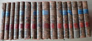 titre et tomaison (reliures très usagées, qqs rousseurs).{CR} Important recueil de 71 pièces de théâtre en éditions originales, constitué par Labiche pour lui-même. À la fin de chaque volume, Eugène Labiche a dressé lui-même, de sa main, la table des pièces qu’il contient.{CR} Tome 1, 8 pièces. Un monsieur qui a brûlé une dame (Lévy, 1856). Le Bras d’Ernest (Lévy, 1857). L’Affaire de la rue de Lourcine (id.). La Dame aux jambes d’azur (id.). Les Noces de Bouchencœur (id.). Le Secrétaire de Madame (id.). Un gendre en surveillance (Lévy, 1858). Je croque ma tante (id.).{CR} Tome 2, 5 pièces. Le Clou aux maris (Lévy, 1858). L’Avare en gants jaunes (id.). Deux merles blancs (id.). Madame est aux eaux (id.). Le Calife de la rue Saint-Bon (Charlieu, 1858).{CR} Tome 3, 6 pièces. En avant, les Chinois ! (Librairie nouvelle, 1859). L’Avocat d’un grec (id.). L’Amour, un fort volume, prix 3 Fr. 50 c. (id.). L’École des Arthur (Lévy, 1859). L’Omelette à la Follembuche (Librairie théâtrale, 1859). Le Baron de Fourchevif (id.).{CR} Tome 4, 5 pièces. Les Petites Mains (Librairie nouvelle, 1859). Voyage autour de ma marmite (Lévy, 1860). Le Rouge-Gorge (Librairie théâtrale, 1859). J’invite le colonel ! (Librairie nouvelle, 1860). La Sensitive (Lévy, 1860).{CR} Tome 5, 5 pièces. Les Deux Timides (Librairie nouvelle, 1860). Le Voyage de Monsieur Perrichon (id.). Un gros mot (id.). La Famille de l’horloger (id.). J’ai compromis ma femme (Lévy, 1861).{CR} Tome 6, 5 pièces. Les Vivacités du capitaine Tic (Lévy, 1861). L’Amour en sabots (id.). Le Mystère de la rue Rousselet (Librairie nouvelle, 1861). La Poudre aux yeux (Lévy, 1862, nouvelle édition). La Station Champbaudet (Librairie théâtrale, 1862).{CR} Tome 7, 5 pièces. Les Petits Oiseaux (Dentu, 1862). Le Premier Pas (id., avec béquet autographe collé à la p. 41, refaisant le début de la scène xv). Les 37 Sous de M. Montaudoin (Dentu, 1863). La Dame au petit chien (id.). Permettez, Madame !... (id.).{CR} Tome 8, 4 pièces. Célimare le bien-aimé (Dentu, 1863). La Fille bien gardée (id.). La Commode de Victorine (Dentu, 1864). La Cagnotte (id.).{CR} Tome 9, 4 pièces. Moi (Dentu, 1864). Un mari qui lance sa femme (id.). Le Point de mire (id.). Premier Prix de piano (Dentu, 1865).{CR} Tome 10, 4 pièces. L’Homme qui manque le coche (Dentu, 1865). La Bergère de la rue Monthabor (id.). Le Voyage en Chine (id.). Un pied dans le crime (Librairie dramatique, 1866).{CR} Tome 11, 5 pièces. Le Fils du brigadier (Librairie dramatique, 1867). La Grammaire (id.). La Main leste (id.). Les Chemins de fer (id.). Le Papa du Prix d’honneur (Lévy, 1868). [À partir de La Grammaire, toutes les pièces portent le cachet encre de la Société des auteurs et compositeurs dramatiques.]{CR} Tome 12, 5 pièces. Le Corricolo (Librairie dramatique, 1868). Le Petit Voyage (id.). Le Dossier de Rosafol (id., 1869). Le Choix d’un gendre (id.). Le Plus heureux des trois (Dentu, 1870).{CR} Tome 13, 5 pièces. Le Cachemire X-B-T (Dentu, 1870). Le Livre bleu (Dentu, 1871). L’Ennemie (id.). Il est de la police (Dentu, 1872). La Mémoire d’Hortense (id.).{CR} Tome 14, 5 pièces. Doit-on le dire ? (Dentu, 1873). 29 degrés à l’ombre (id.). Garanti dix ans (Dentu, 1874). Brûlons Voltaire ! (id.). Madame est trop belle (id.).{CR} Tome 15, 4 pièces. La Pièce de Chambertin (Dentu, 1874). Les Trente Millions de Gladiator (Dentu, 1875). Les Samedis de Madame (id.). Un mouton à l’entresol (id.).{CR} Tome 16, 3 pièces et 3 discours. Le Prix Martin (Dentu, 1876). La Cigale chez les fourmis (id.). La Clé (Dentu, 1877). Discours de réception [à l’Académie Française] ; Réponse de M. John Lemoinne (Lévy, 1881). « Discours au banquet du Lycée Fontanes » (27 janvier 1882).{CR}