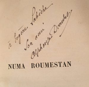 Alphonse DAUDET. Numa Roumestan, mœurs parisiennes (Paris, G. Charpentier, 1877) ; in-12, reliure de l’époque demi-veau blond.{CR} Édition originale, avec envoi autographe signé sur le faux-titre : « à Eugène Labiche son ami Alphonse...